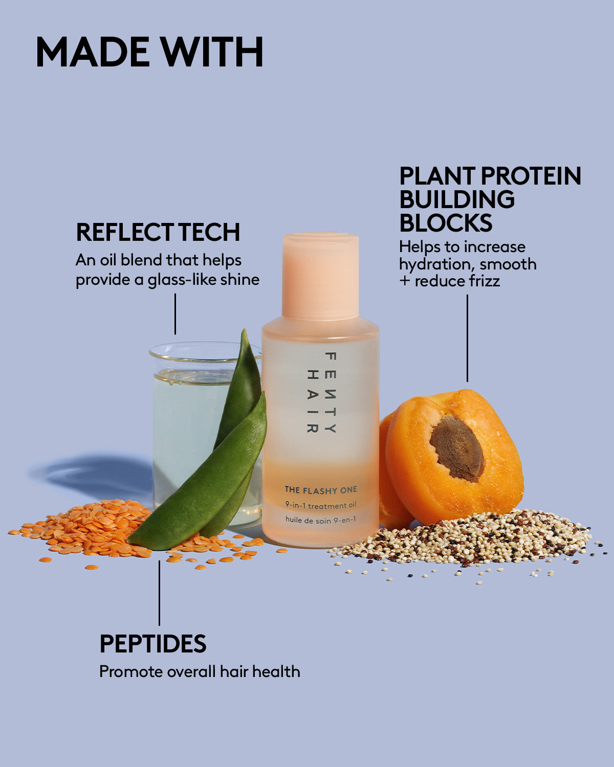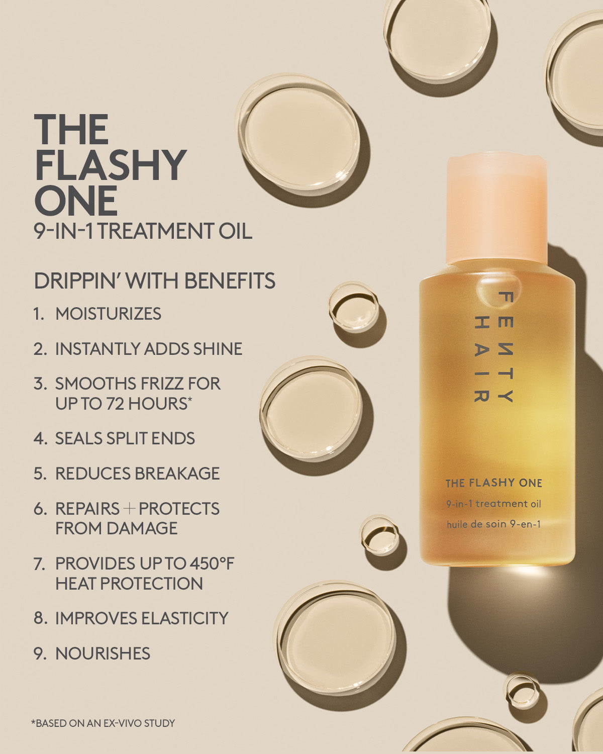 A 9-in-1 bi-phase treatment oil that moisturizes. instantly adds shine. smooths frizz for up to 72 hours. seals split ends. reduces breakage. repairs + protects from damage. provides up to 450??F of heat protection. improves elasticity + nourishes.